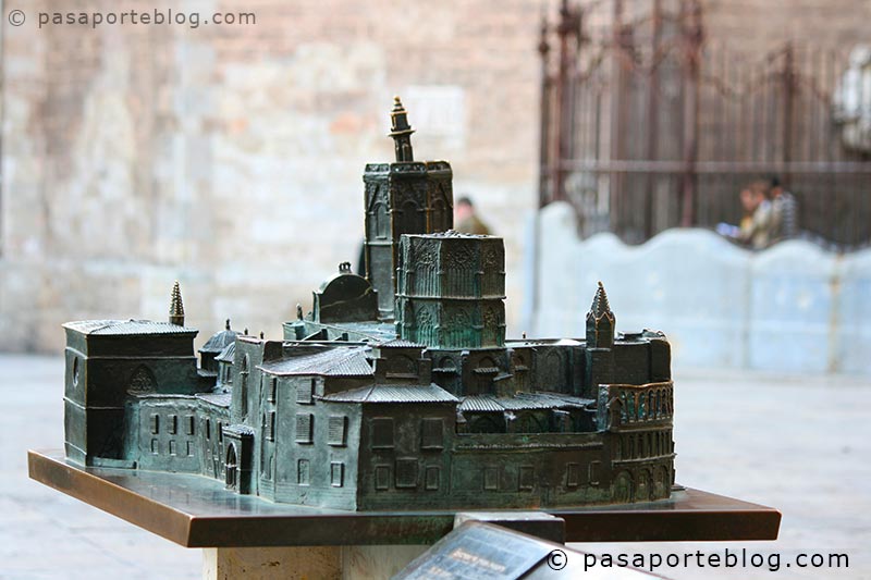 Junto a la puerta barroca podemos ver una pequeña escultura que representa esta heterogénea catedral, con sus puertas Barroca, Gótica y Románica.